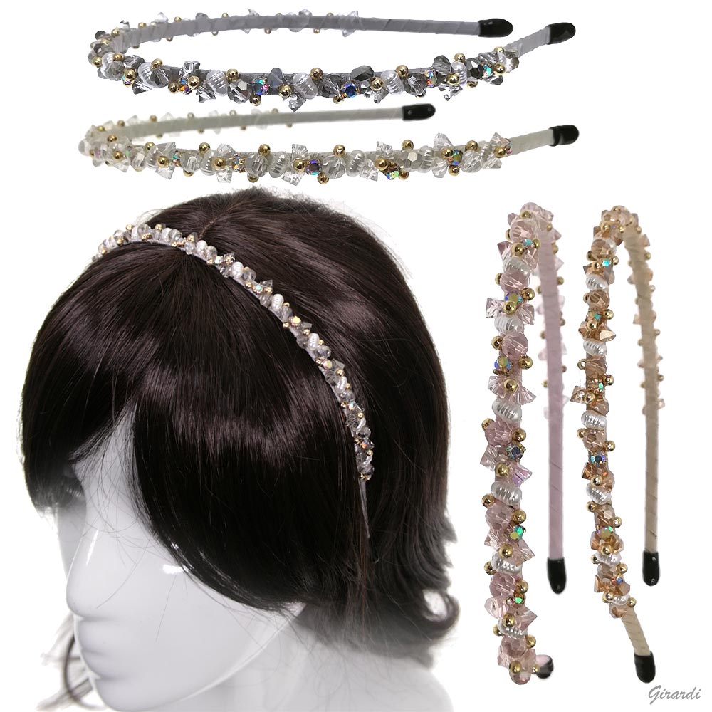 Acetate headband covered with wool ribbon, decorated with with copper chain, pearls, crystals and rhinestones.