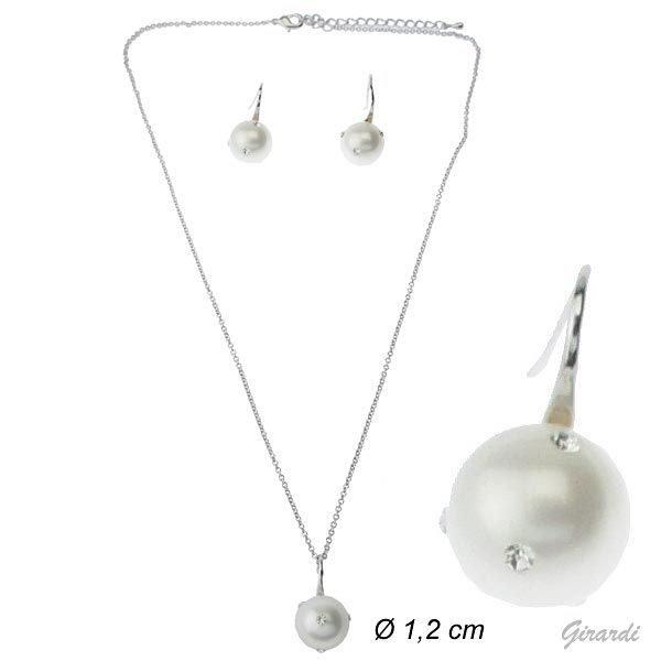 Elegante Parure composta da Collana a Catenina, Perla con Strass Bianchi pendente e Orecchini abbinati.Nickel Free.Lunghezza catenina cm 40Ciondolo cm 2Orecchini lunghi cm 2